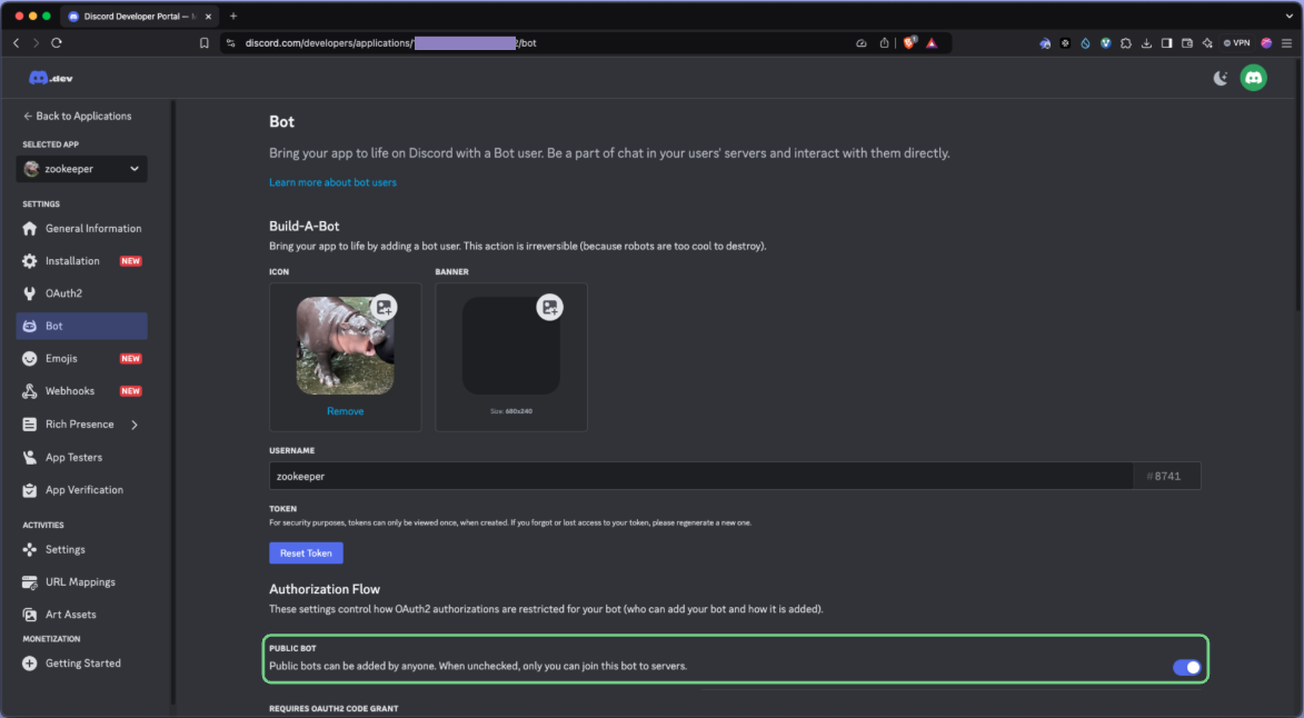 ไป check public bot ว่าเปิดอยู่ไหม โดย default แล้ว บอทจะเป็น public bot ใคร ๆ ก็สามารถพาน้องบอทมาที่ server ตัวเองได้