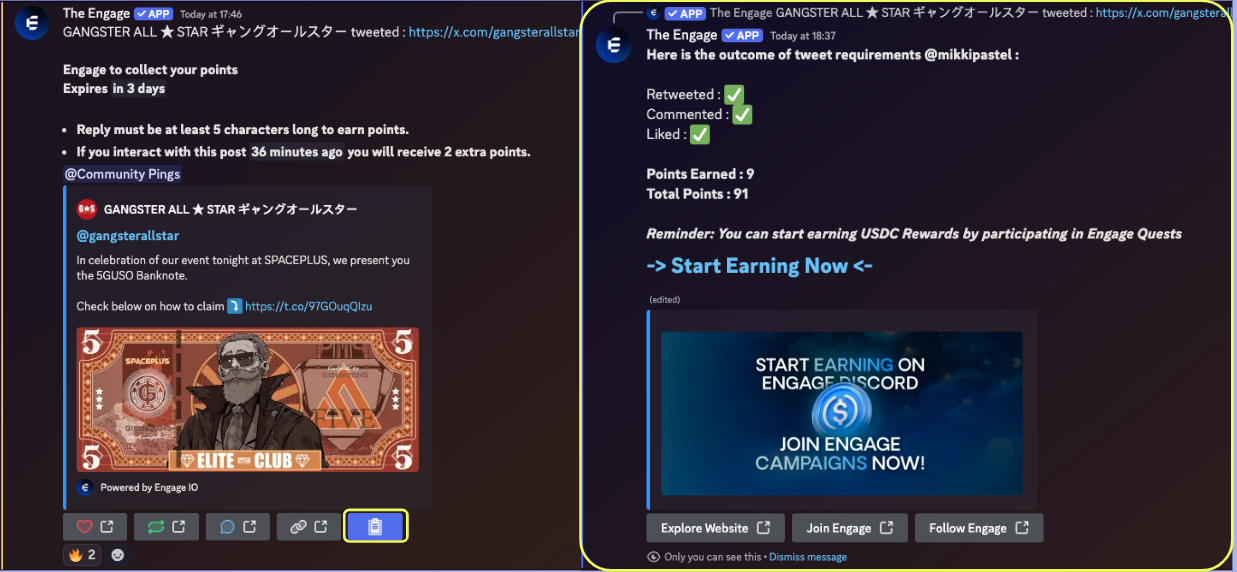* The Engage: engage กับ post เพื่อเก็บแต้ม และเอาไปแลกของต่าง ๆ ใน server ได้โดยการ raffle